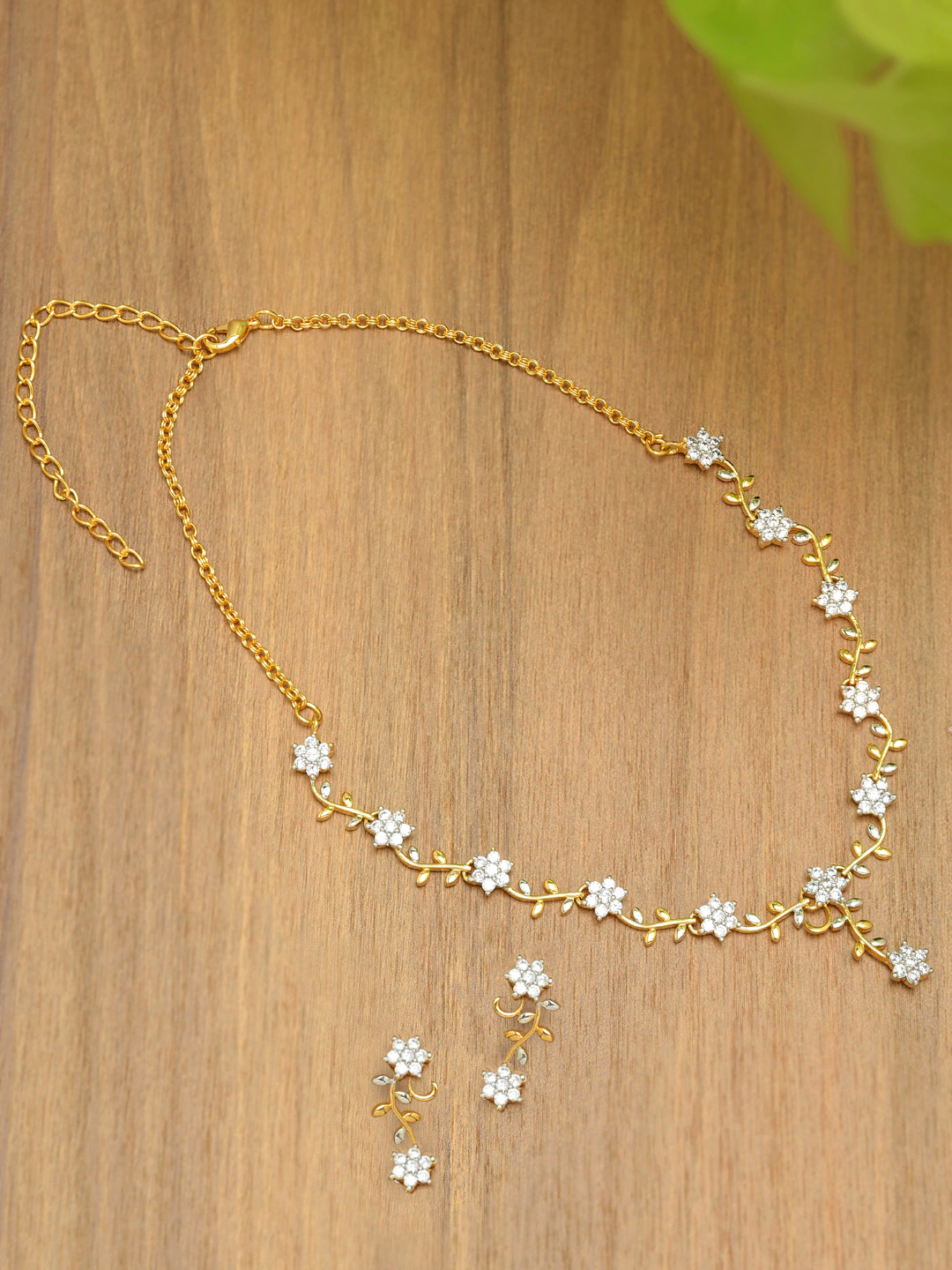 Gold-plated necklace with CZ stone-studded details, leaf and floral-shaped details,