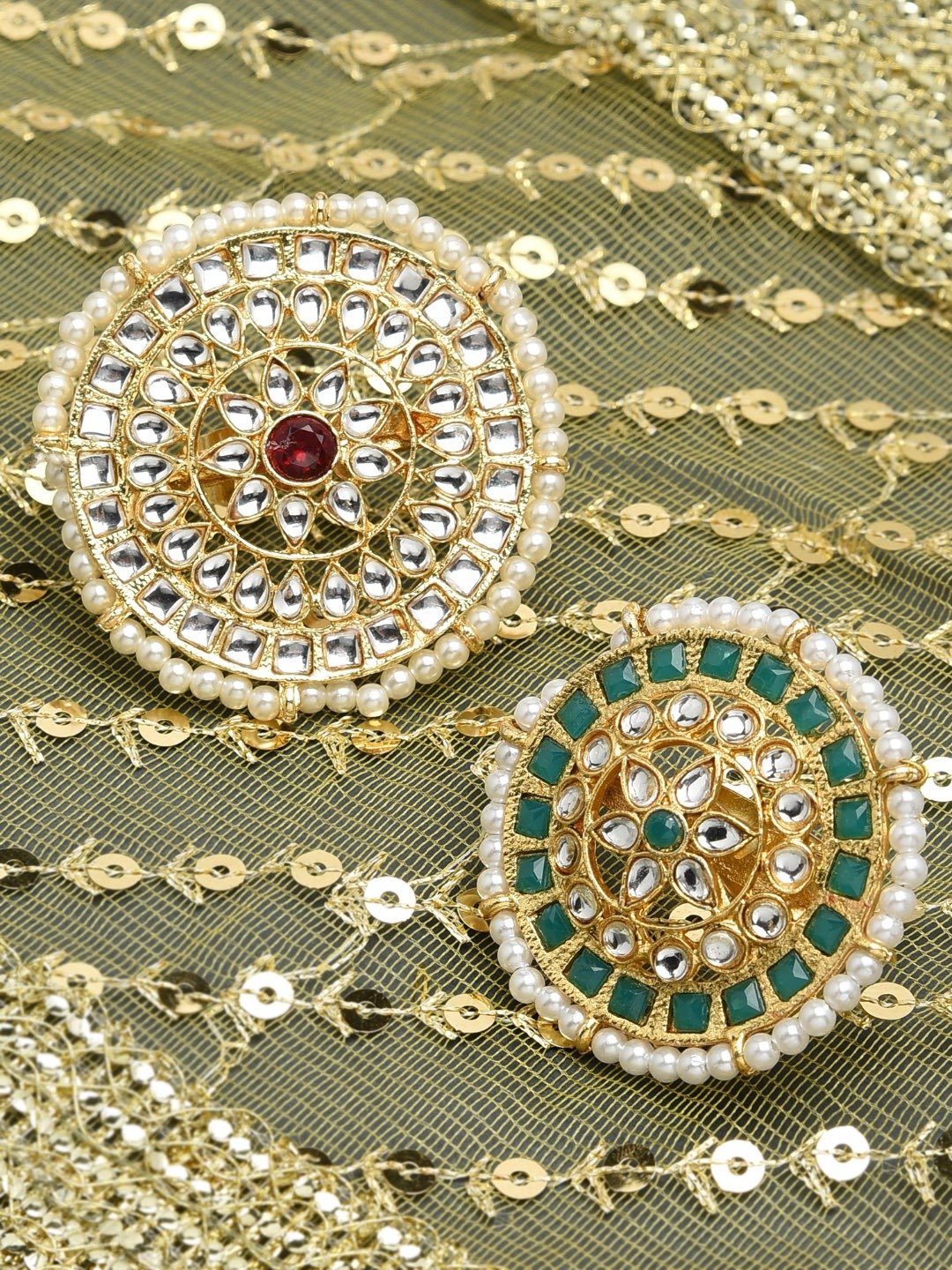Gold-plated green Kundan-studded adjustable finger rings